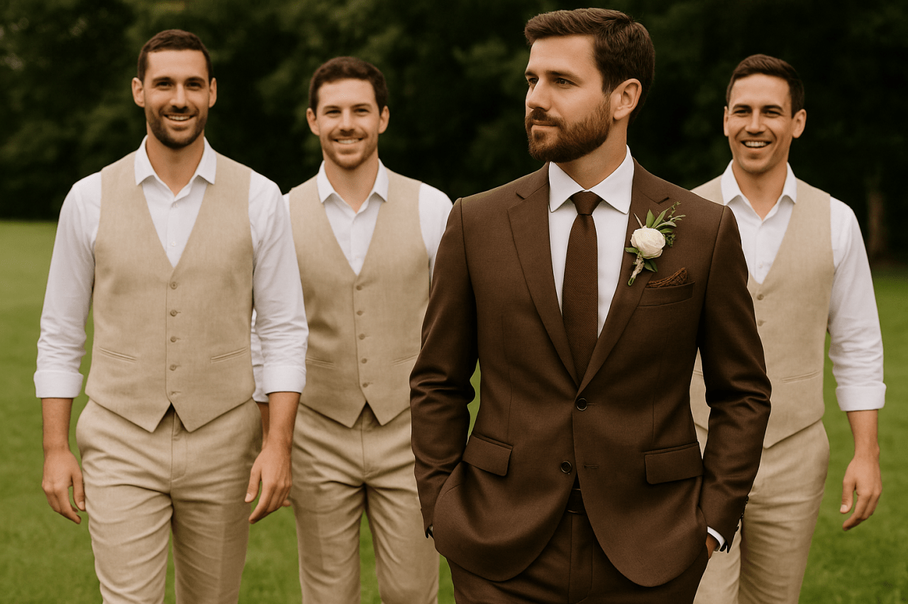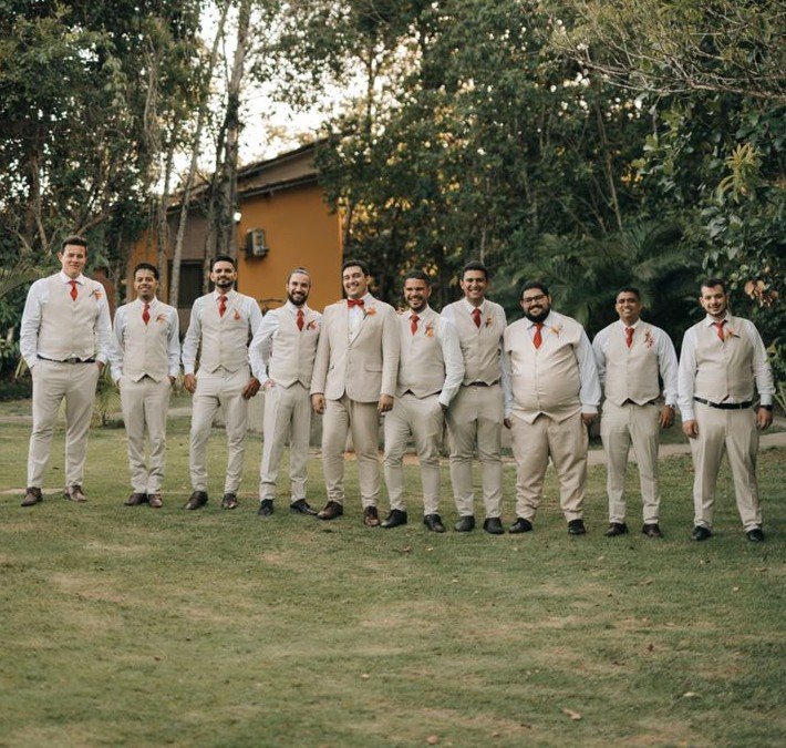Cada um de vocês recebeu uma gravata verde oliva, escolhida com carinho para compor o visual dos padrinhos, combinando com o colete bege que usaremos na cerimônia.